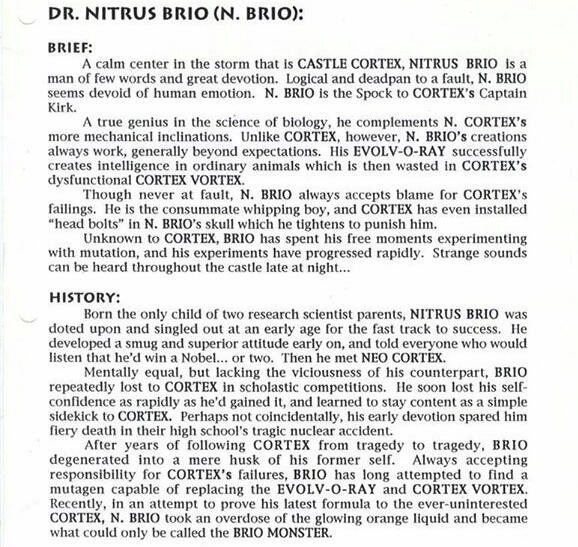 KINDA. While Mind Over Mutant, It's About Time, and On The Run each affirm that our favorite little man in green has returned to CORTEX's side, this BRIO is as he was last seen within the Naughty Dog continuity: self-proclaimed sworn enemy of NEO CORTEX and all affiliated parties, and just a holo-transmission away if the bandicoots ever feel like teaming up, but otherwise staying out of sight, up to who knows what on his own."UNCLE" BRIO is not a BRIO of the past, who simply has yet to progress to the events of these games, but a BRIO who's been living quietly in your PLAYSTATION since 1999, inhabiting an archived world that's persisted quietly past the events of CTR untouched by the sweaty, overworked hands of game developers, and uninterrupted by the twists and turns their divine intervention might otherwise bring.With the exception of being dragged to the Academy of Evil (because honestly, the notion of children going to evil school is too funny to pass up) some time after he and CORTEX first ran away together, this instance of N. BRIO only incorporates canon from the Naughty Dog-era titles and their supplemental materials, including this particular draft of the first game's production bible seen below. But beyond that, be warned that the rest of UNCLE BRIO'S character is comprised chiefly of "shit I just made up and thought it would make for a fun character."